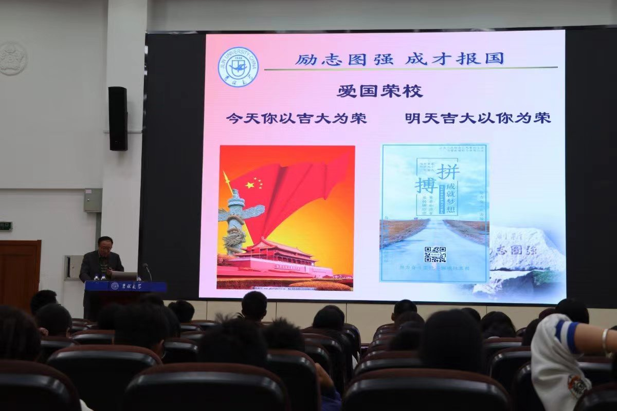 党委书记曲渊立以“吉林大学74载春华秋实、风雨兼程”为引,详细的为同学们介绍了吉林大学的历史沿革和文化内涵,红色革命精神、“满腔热忱,精益求精”的白求恩精神、“矢志不渝,自强不息”的唐敖庆精神、“心有大我,赤诚报国”的黄大年精神等共同组成了吉林大学求实创新、励志图强的精神内核。“今天你以吉大为荣,明天吉大以你为荣”,鼓励同学们勤奋学习,勇于探索,努力汲取知识,提升能力,丰富阅历,肩负起新时代青年的使命与担当。