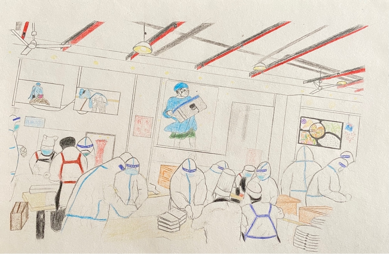 创作理念:吉林大学的一句推送“孩子们,我们一定把饭供上”令人破防。工作人员和身穿防护服的人员正在打包饭菜,三荤一素,每天三顿,还有额外的零食和水果,我们在这里被爱和关怀。