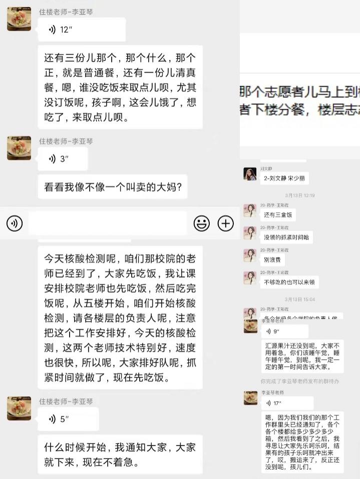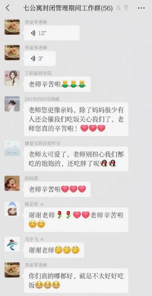 发的物资,晚饭,核酸检测,生活秩序…如此循环往复。我的脑子里都是驻楼老师忙碌的身影和她常说的一些话语“几楼缺多少个桔子”、“大家谁的饭不够吃或者没订饭还想吃的就来一楼取,一定一定不要客气”、“孩子们你们先睡会觉,等核酸检测来了我叫你们你们再下来”、“孩子们不要减肥了,好好吃饭”、“孩儿们,不要着急,饭马上就到,今天送饭的车在路上出了点故障”…一声孩子们,孩儿们安抚了多少学生们的心啊。很多时候忙完一天工作都要到深夜,还记得有一次我们宿舍晚上一起看恐怖片晚上十二点了出去上厕所,然后碰到李老师,还夸我们深夜出来带口罩很听话,然后又让我们赶紧睡觉别熬夜,多问了两句才知道李老师刚开完会还没洗漱呢,顿时心里非常暖,也非常感动。