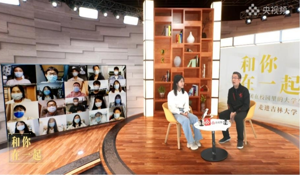 学生代表与白岩松老师和江梦南师姐一起共同参与现场直播。