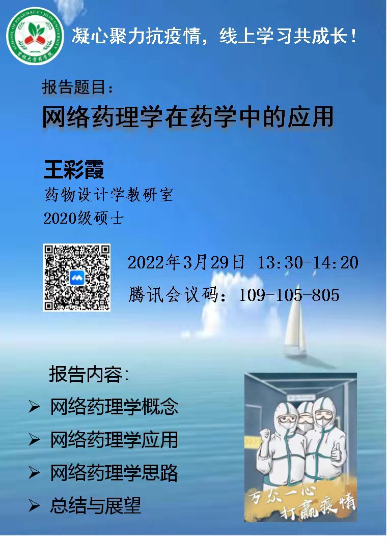 药物设计学教研室李平亚教授和刘金平教授于3月29日下午13:30组织开展了一场《网络药理学在药学中的应用》线上培训,网络药理学作为一门新的交叉学科,将网络科学、生物信息学、计算机科学和数学等学科的方法结合到中药药理的研究中,从分子水平和分子网络调控的背景中阐明中药的作用机理。而且网络药理学对于现在疫情中的同学们来说,最大的优势就是不需要进入实验室做实验,所以非常实用。