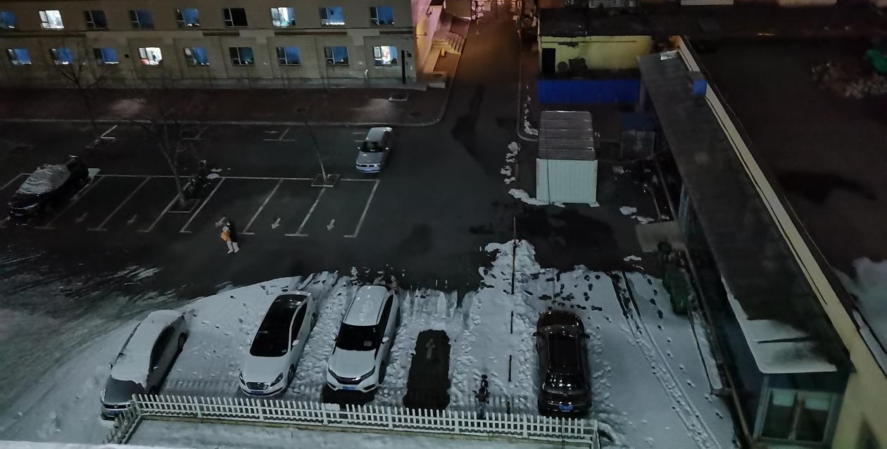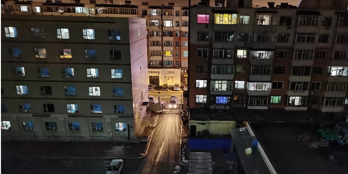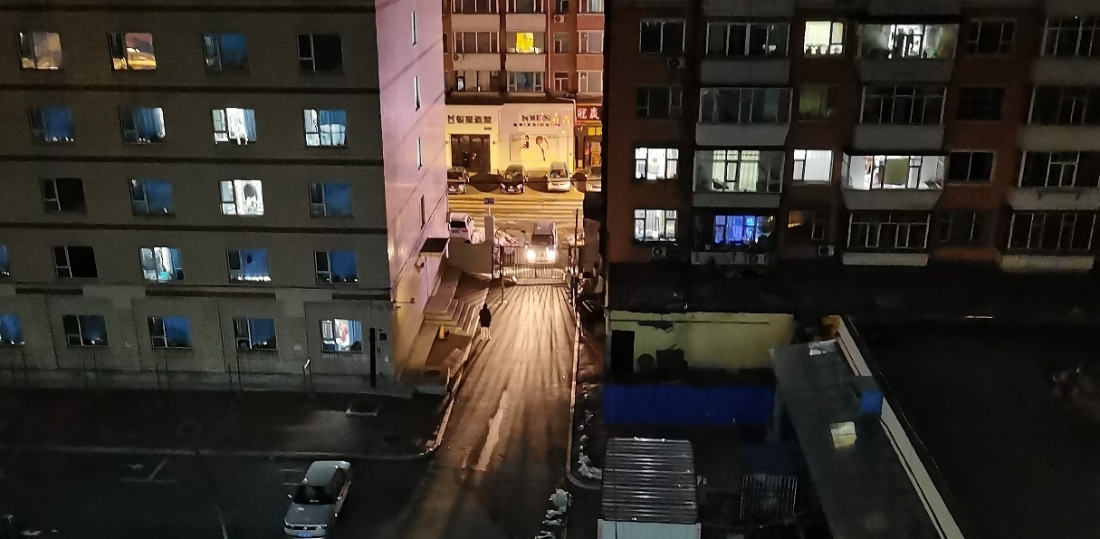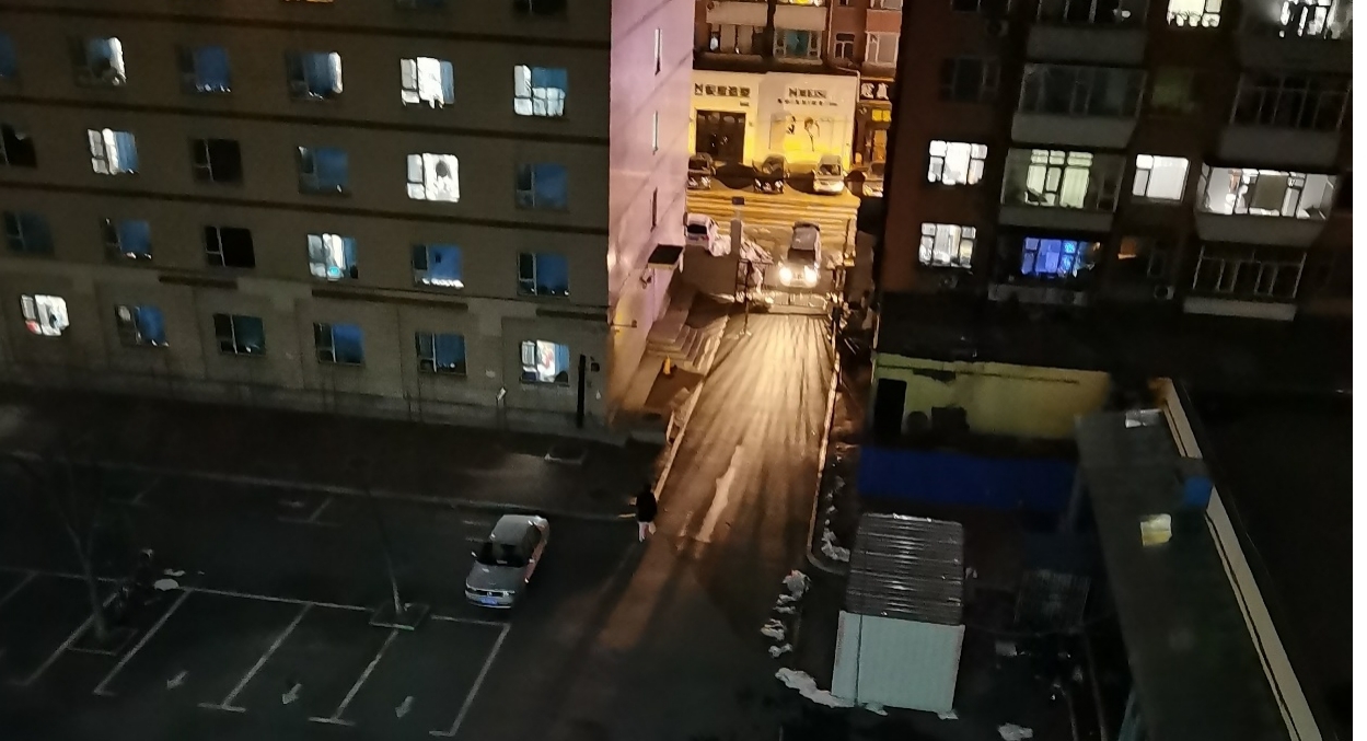 文字说明:今晚九点左右去洗漱间洗漱的时候,站在窗边放风,偶然看到了停在栅栏外的物资车,这么晚了工作人员还在为学生们保障后勤。