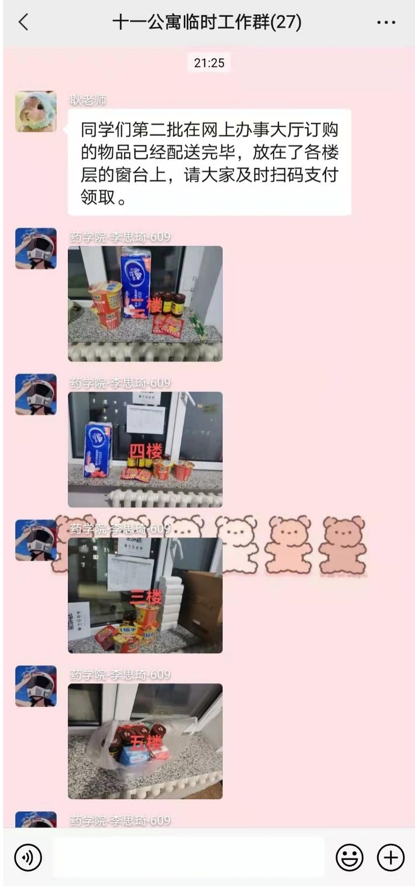 文字说明:21:25分,新民11公寓志愿者工作群里发来领取物资的消息,前后不到半个小时,各位老师、志愿者同学们辛苦啦!