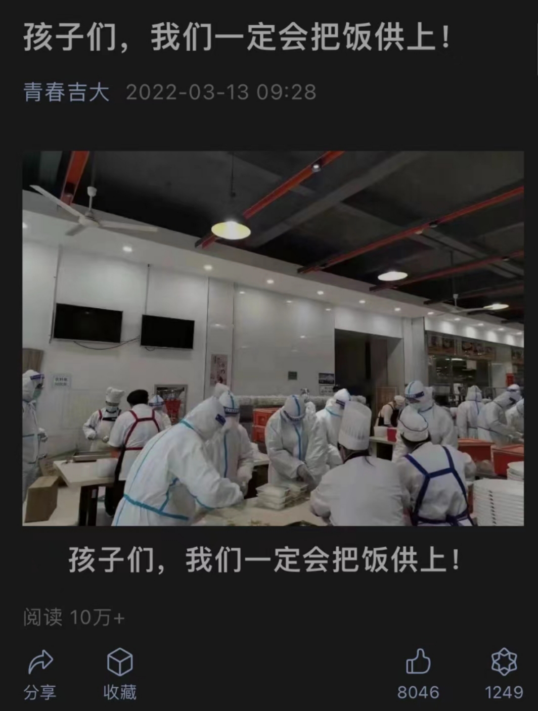 还记得那篇只有一张图片的推文吗?吉林大学官方公众号发布发的那则《孩子们,我们一定会把饭供上!》中,头戴厨师帽的叔叔阿姨和穿着防护服的工作人员,正在食堂里紧锣密鼓地打包饭菜,由志愿者向各公寓楼的在校生送来三餐。万事开头难,总会遇到各式各样的问题,但澳门六合彩开奖网
