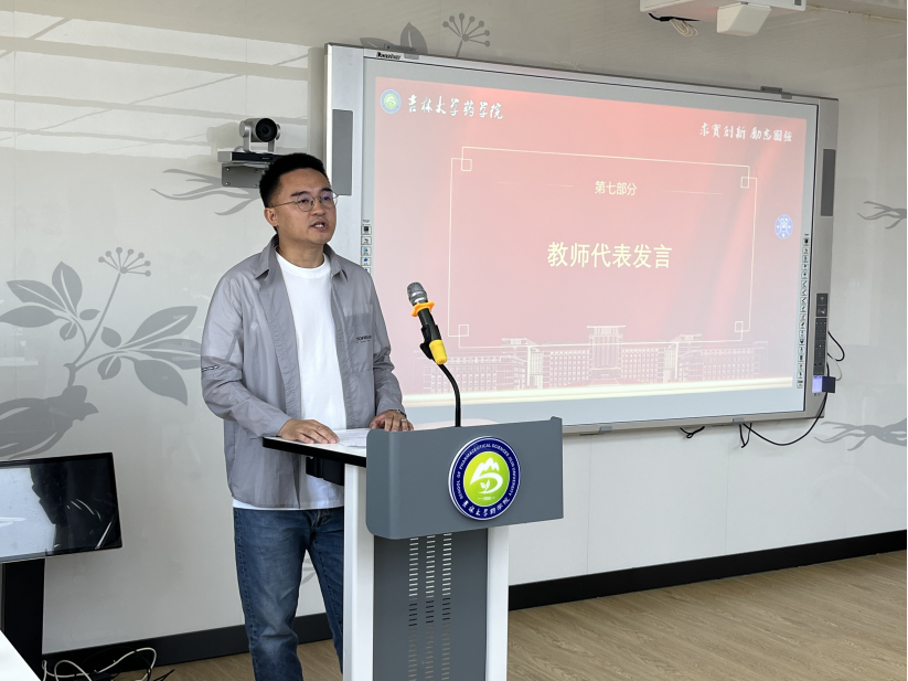 青年教师、药学系孙伟伦副教授作为教师代表发言。他向毕业生表达了诚挚的祝愿,勉励大家在科研道路上勇于创新、勇攀高峰。他强调,药学工作者应注重创新实践,积极推动新药研发与成果转化,切实解决临床用药问题,以专业知识服务公众健康。